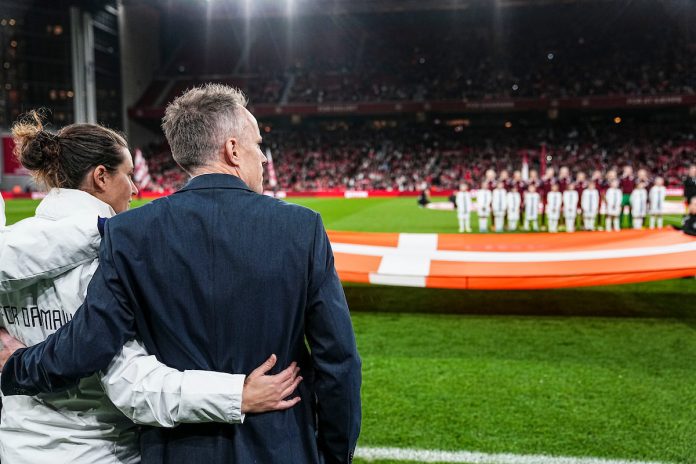 UEFA Womens Nations League Playoff i Parken - Denmark vs. Finland. Johanna Rasmussen, ass. træner Danmark og Jakob Michelsen, landstræner Danmark Foto: Lars Rønbøg - dbufoto.dk