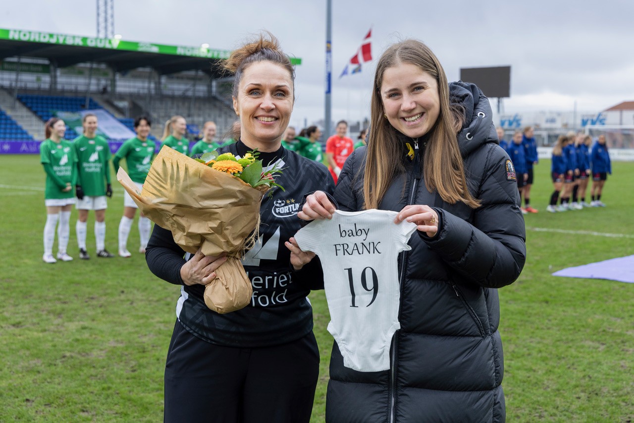 Hun blev i forbindelse med kampstart hyldet og lykønsket med blomster og fodboldbeklædning til det kommende barn.