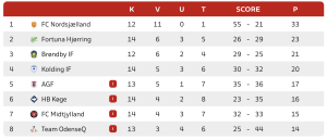 FC Nordsjælland er henholdsvis 10 point foran Fortuna Hjørring, men har to kampe i hånden, mens Brøndby IF hænger to point efter Hjørring-klubben med samme antal kampe som FC Nordsjælland.